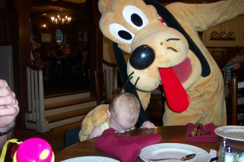 Eating supper at Liberty Tree Tavern, a character dining meal…..Grayson loved them all and Ava Clair sometimes tolerated them! She was a little unsure of Pluto here!