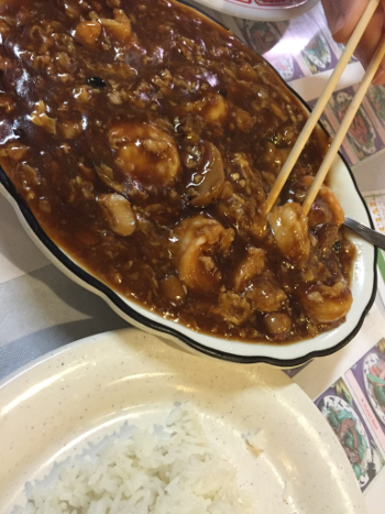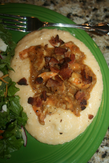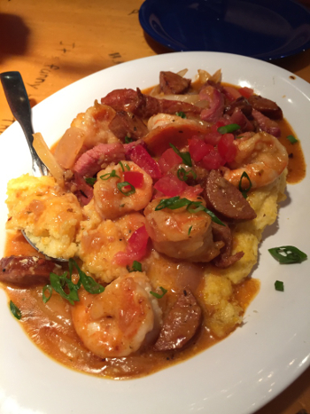 We checked into our hotel, the Hyatt Regency, and got cleaned up, then headed out into New Orleans. I was NOT hungry, but Tim was, and he wandered around until something grabbed his attention, which in this case was Bubba Gump. Chain restaurants, that’s what he picks in a foodie town! We were not hungry, so we split an entree and a dessert. I’d like to say they were great, but they were just ok. We split shrimp and grits and then a chocolate chip skillet cookie for dessert. Tim commented as we were eating that he prefers my shrimp & grits and skillet cookie to theirs 🙂