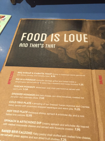 Cute menu on cardboard at Reginelli’s Pizzeria: